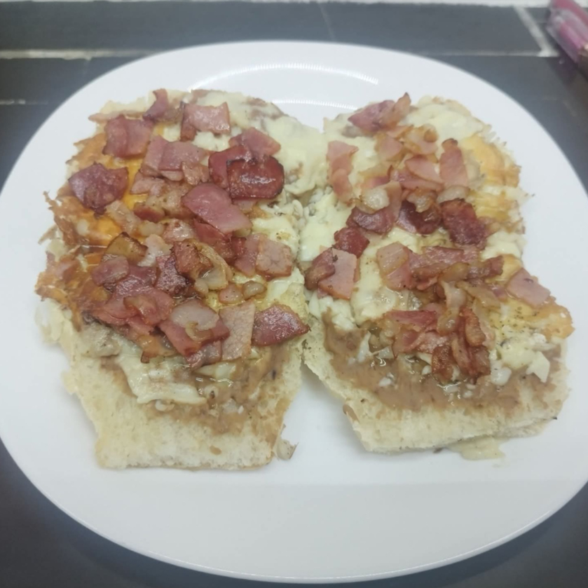 TELERA EN DOS PIEZAS CON UNA CAMA DE FRIJOL CUBIERTA DE QUESO GRATINADO Y TOCINO DORADO