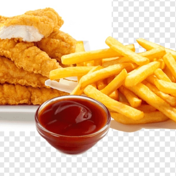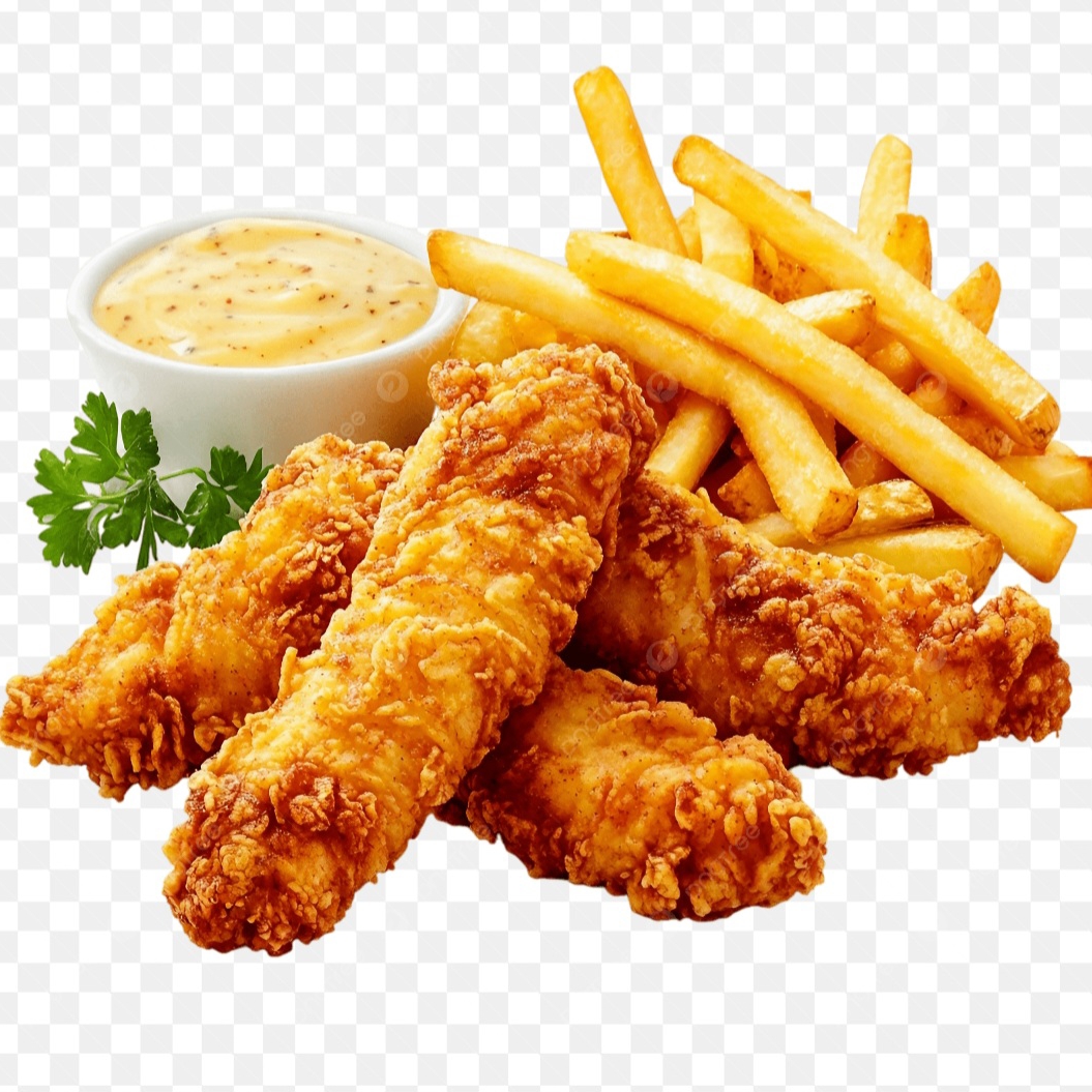 4 PZ DE TENDERS BAÑADOS EN TU SALSA FAVORITA ACOMPAÑADOS DE PAPAS A LA FRANCESA