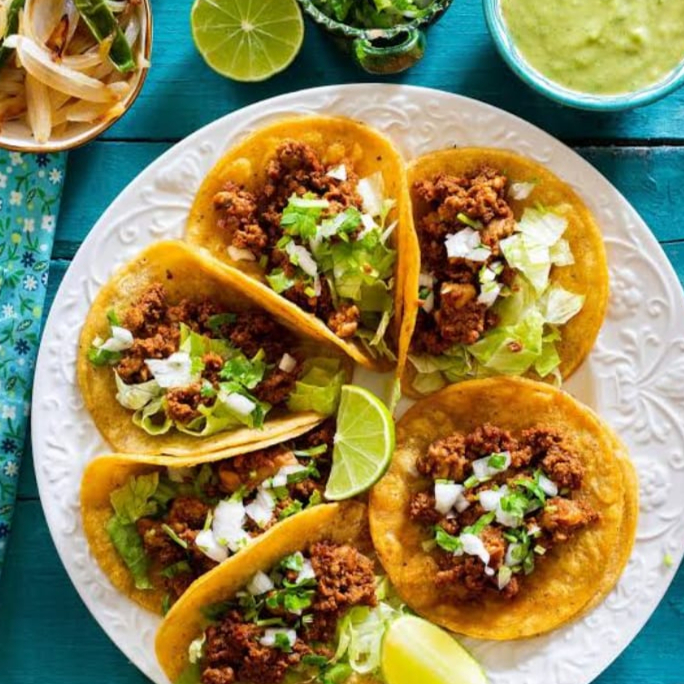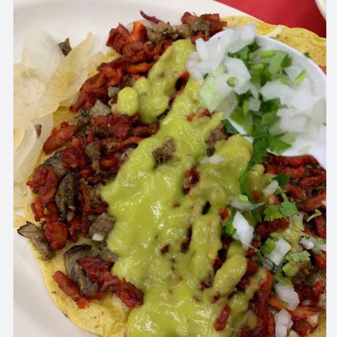10 PZ DE TACOS DE BISTREC, ACOMPAÑADOS DE CEBOLLA Y CILANTRO, LIMONES Y SALSA