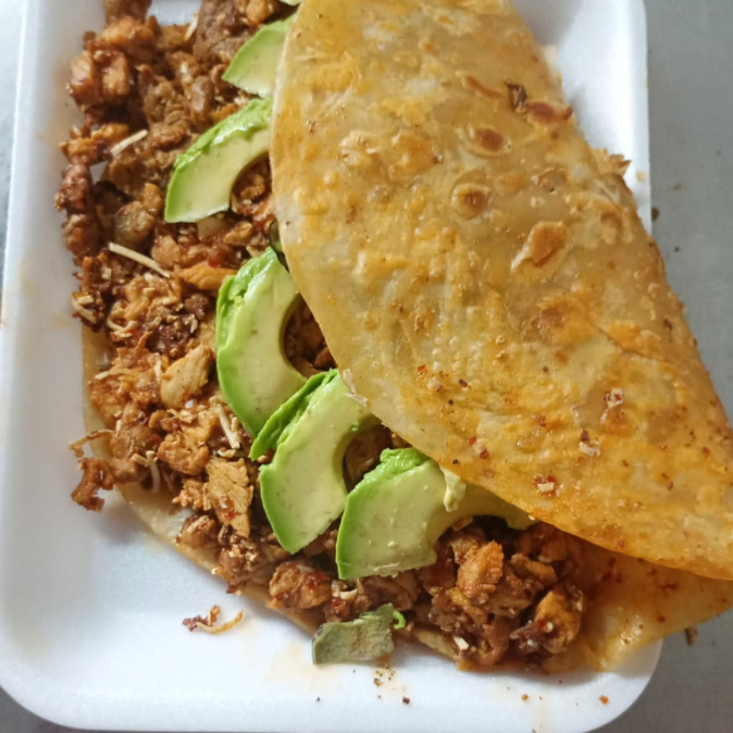 TORTILLA DE HARINA MEDIANARELLENA DE CARNE DE TROMPO Y BISTEC CON QUESO GOUDA, AGUACATE,VERDURAS Y SALSA