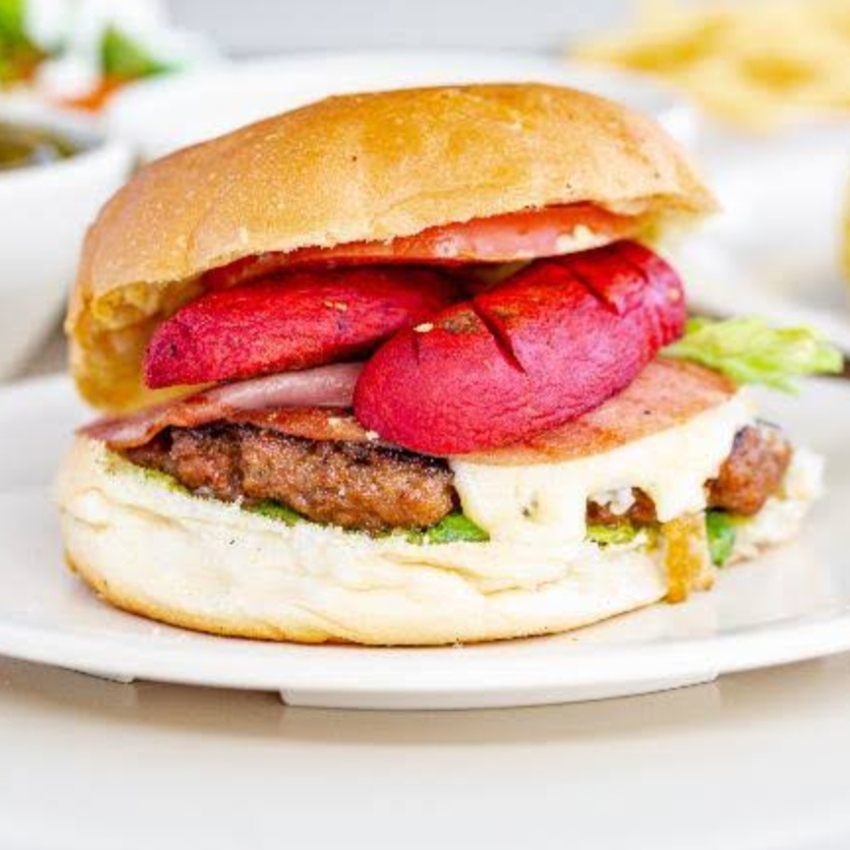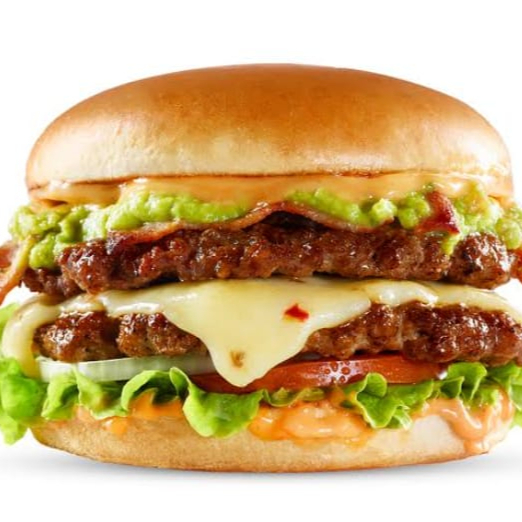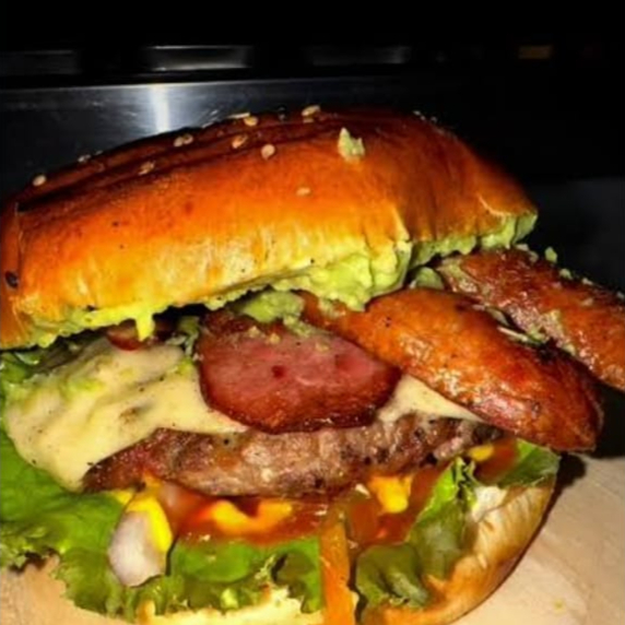 Doble carne de res, doble queso americano, doble queso gouda, doble jamon, lechuga y aderezos