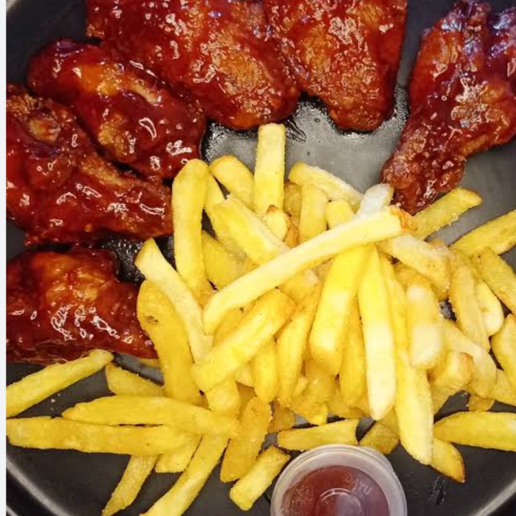 ALITAS BAÑADAS EN TU SALSA FAVORITA ACOMPAÑADAS DE PAPAS A LA FRANCESA