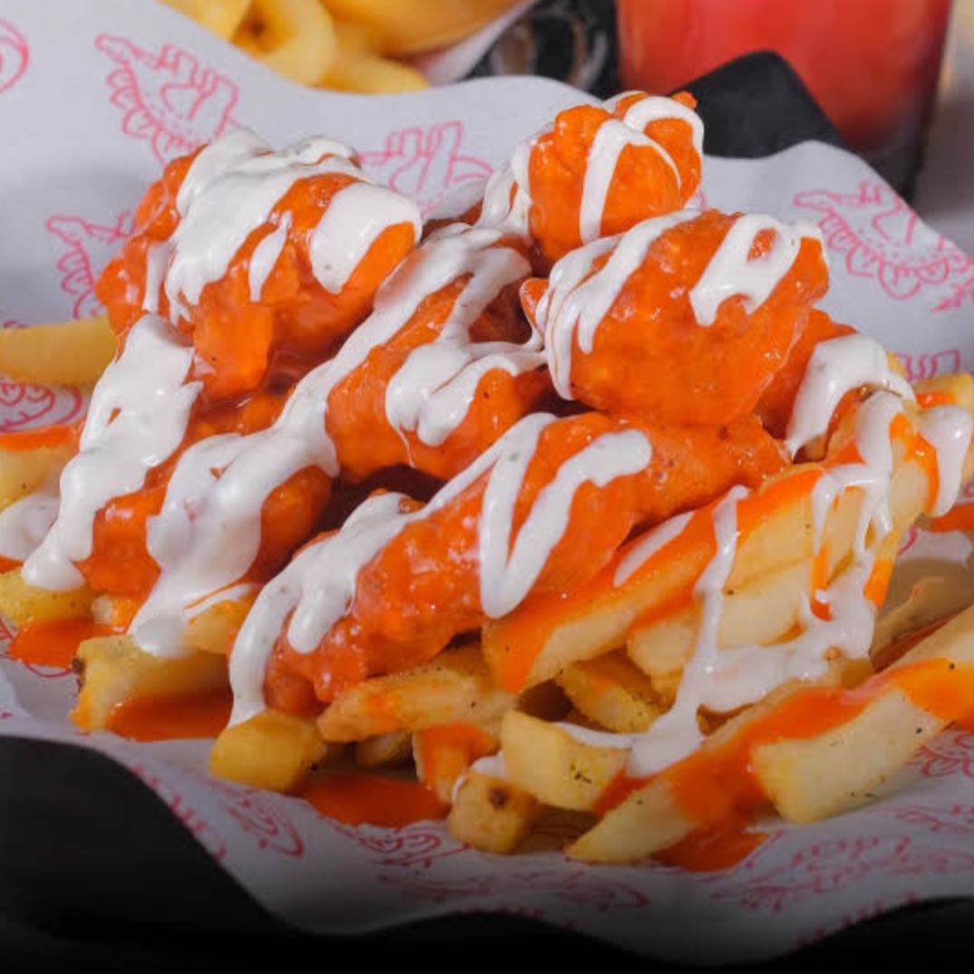 CAMA DE PAPAS A LA FRANCESA CON BONELES BAÑADOS EN SALSA BUFALO Y ADEREZO RANCH