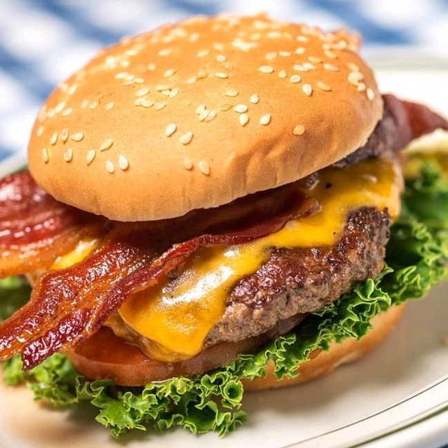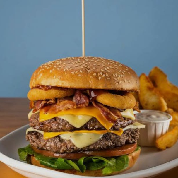 DOBLE CARNE DE RES, QUESO AMERICANO, JAMON,LECHUGA, ADEREZOS ACOMPAÑADA DE PAPAS A LA FRANCESA