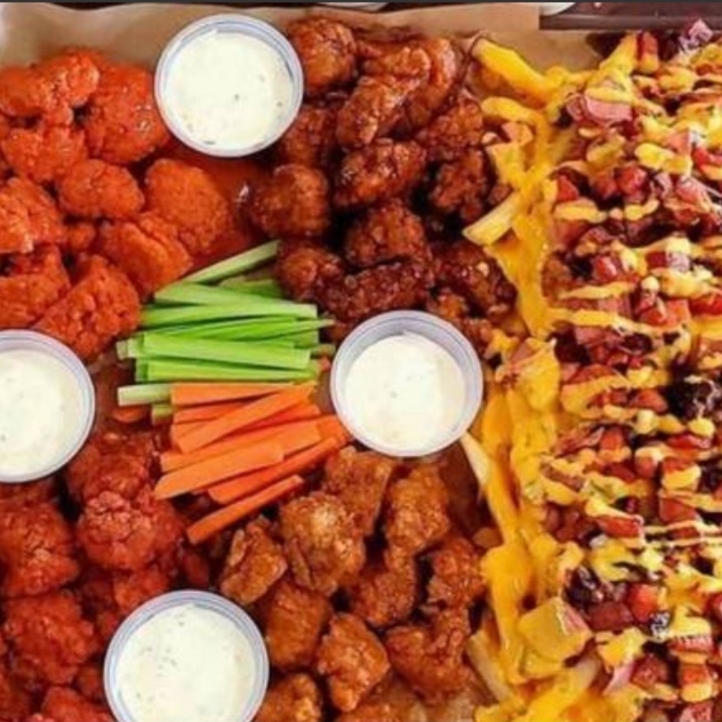 2 KG DE BONEKLES BAÑADOS EN SALSA BUFALO, BBQ Y MANGO HABANERO CON PAPAS A LA FRANCESA FAMILIARES BAÑADAS
