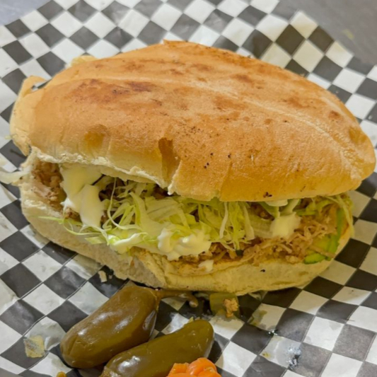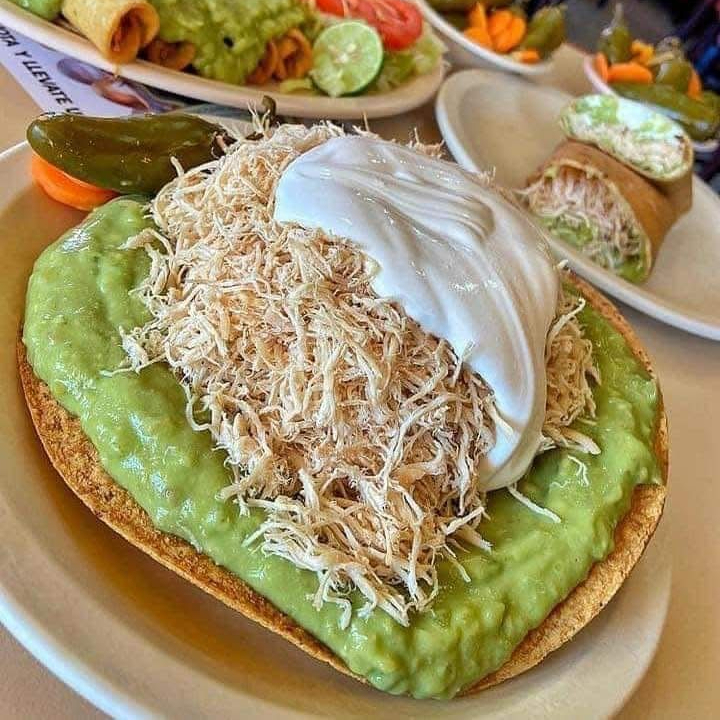 Carne de puerco, lechuga, tomate, crema, aguacate y aderezo