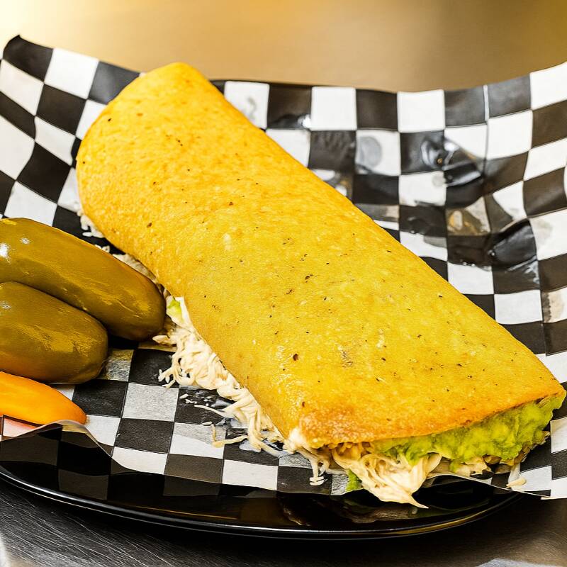 Pollo, papas fritas, lechuga, tomate, aguacate y crema