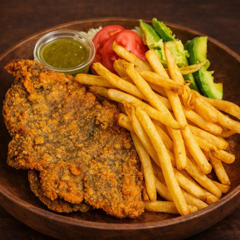Milanesa empanizada y crujiente, acompañada de ensalada y papas a la Francesa.