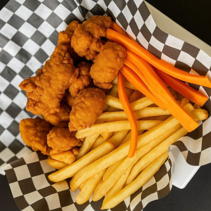 250g de boneless de pollo, papas a la francesa y zanahoria, acompañado de salsa y aderezo