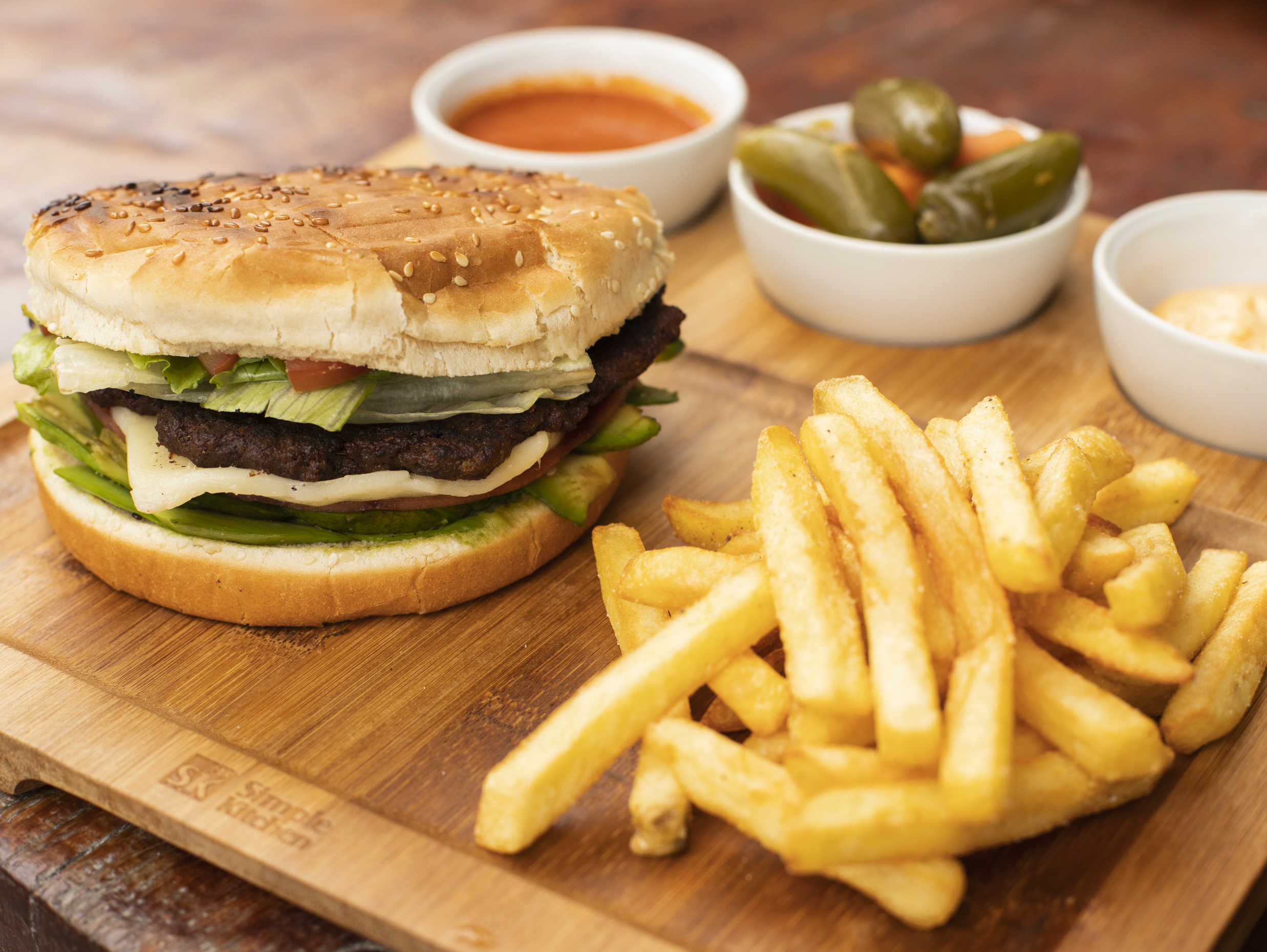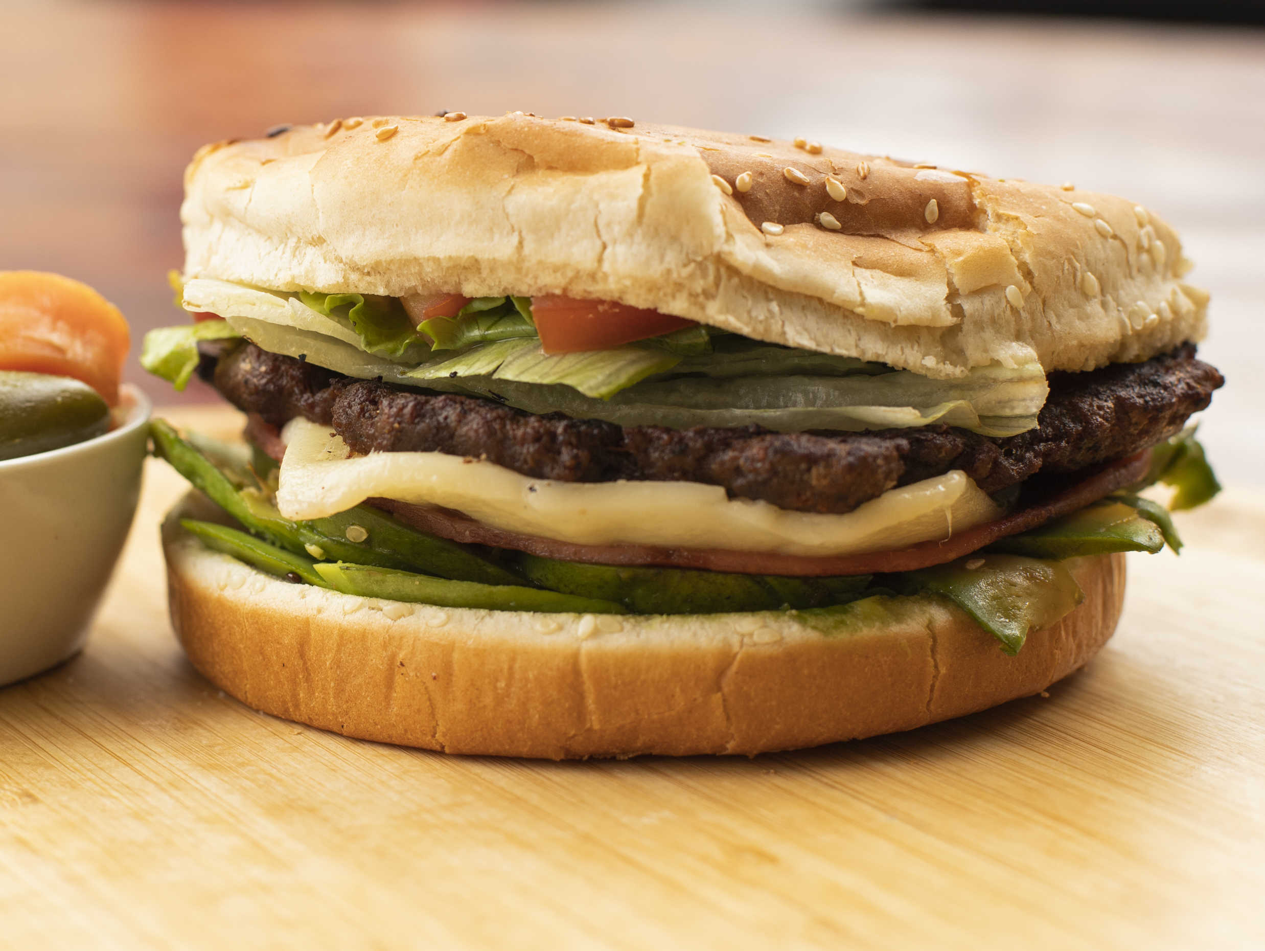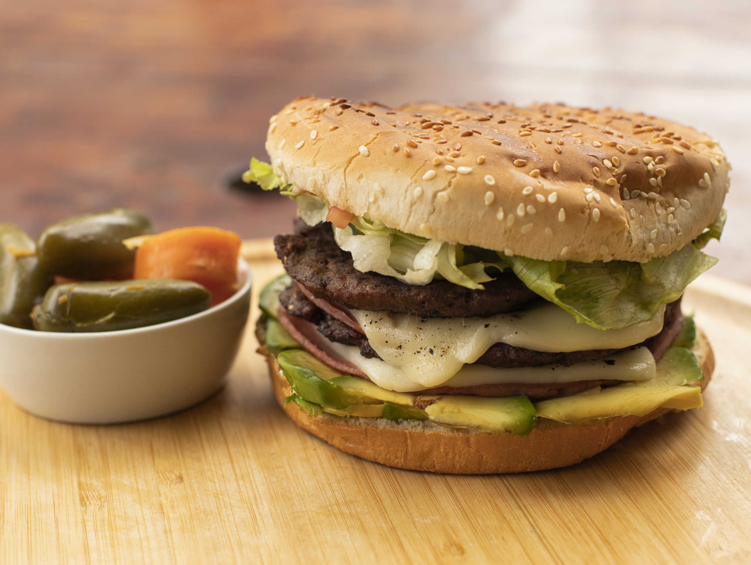 Burger con doble carne, doble jamón y doble queso, un reto acabársela.