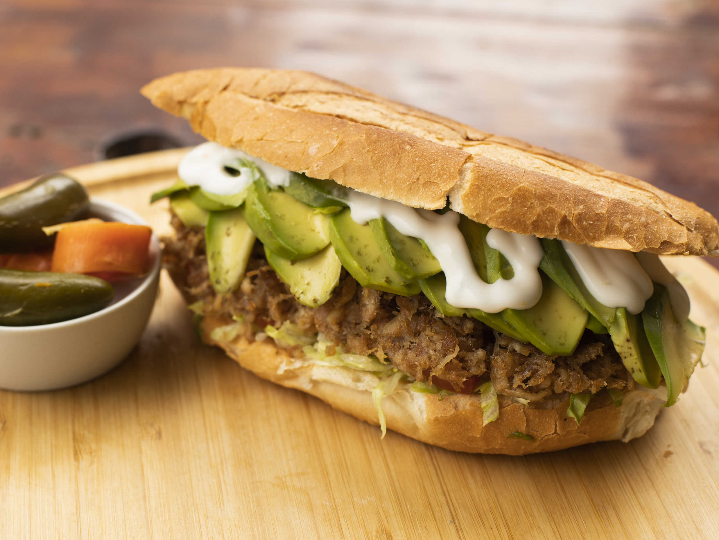 Nuestra torta de siempre, por la que regresan nuestros clientes, con carne de puerco, mucho aguacate, lechuga, tomate y crema.