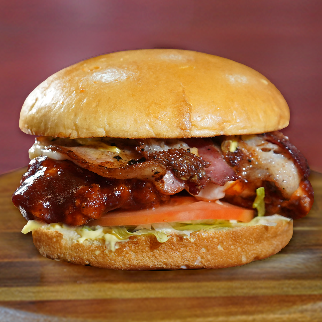 Hamburguesa de pollo empanizado bañado en salsa BBQ, tocino ahumado, queso cheddar y aderezo de la casa.