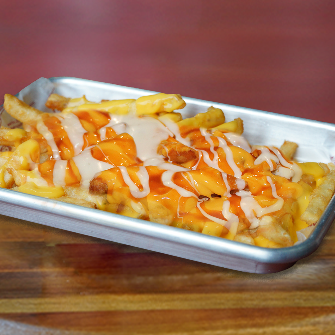 Papas a la francesa bañadas de queso amarillo cheddar, salsa buffalo y aderezo ranch.