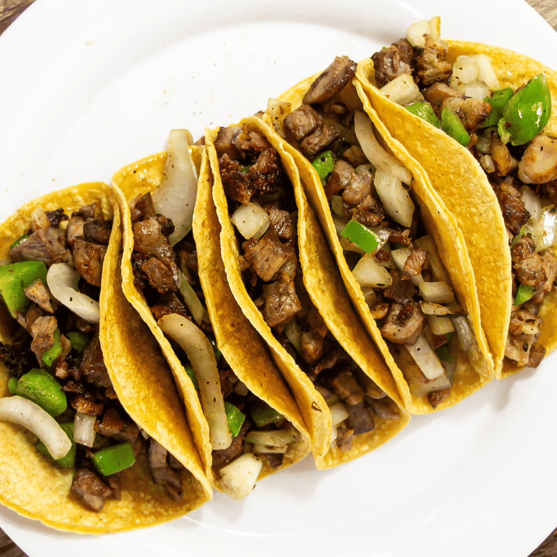 Orden de 5 tacos de res con tocino, morrón y cebolla, acompañados con cebolla asada y papitas de galeana.