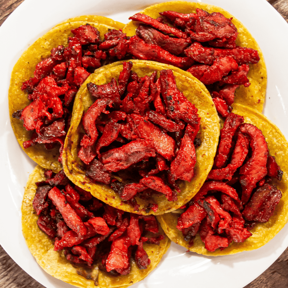 Orden de 5 tacos de trompo en tortilla de maíz. Incluye salsa verde, salsa roja, cebolla, cilantro y limón.