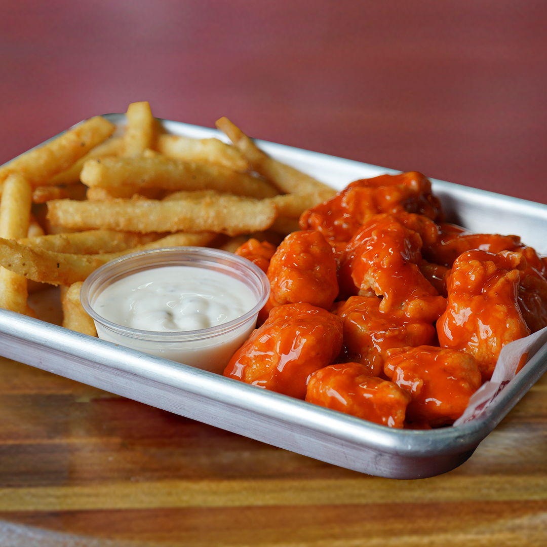 Boneless de pechuga de pollo empanizado bañados en salsa buffalo y aderezo ranch. Incluye papas a la francesa.
