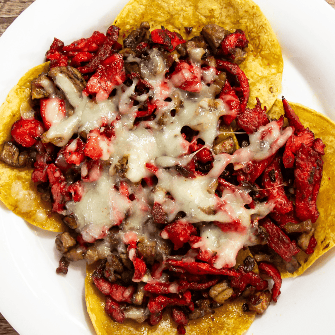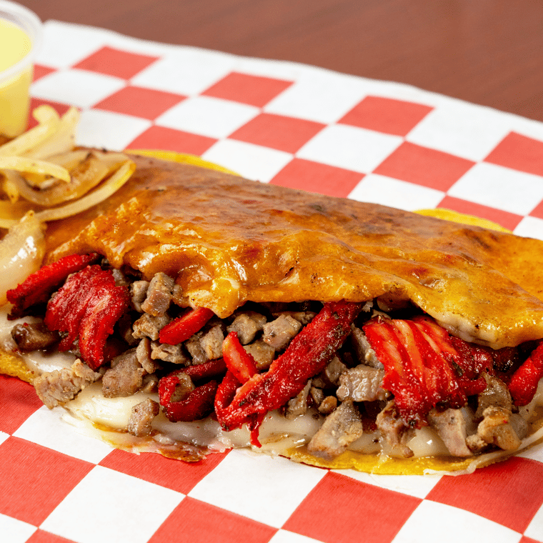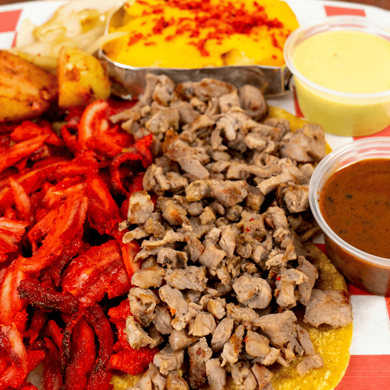 Carne de res y trompo revuelta con queso fundido, se sirve sobre una cama de 5 tortillas de maíz. Acompañado con una papa asada jr.