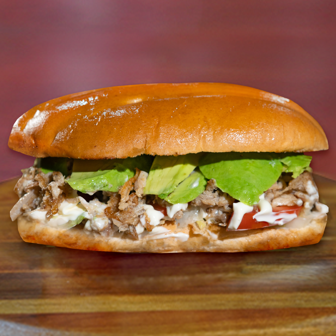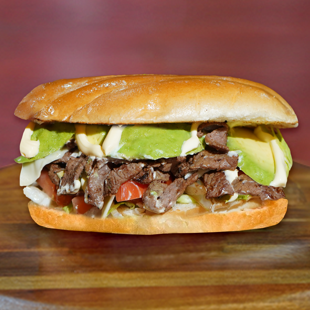 Carne asada con cebolla asada, queso blanco, lechuga, tomate, aguacate y mayonesa