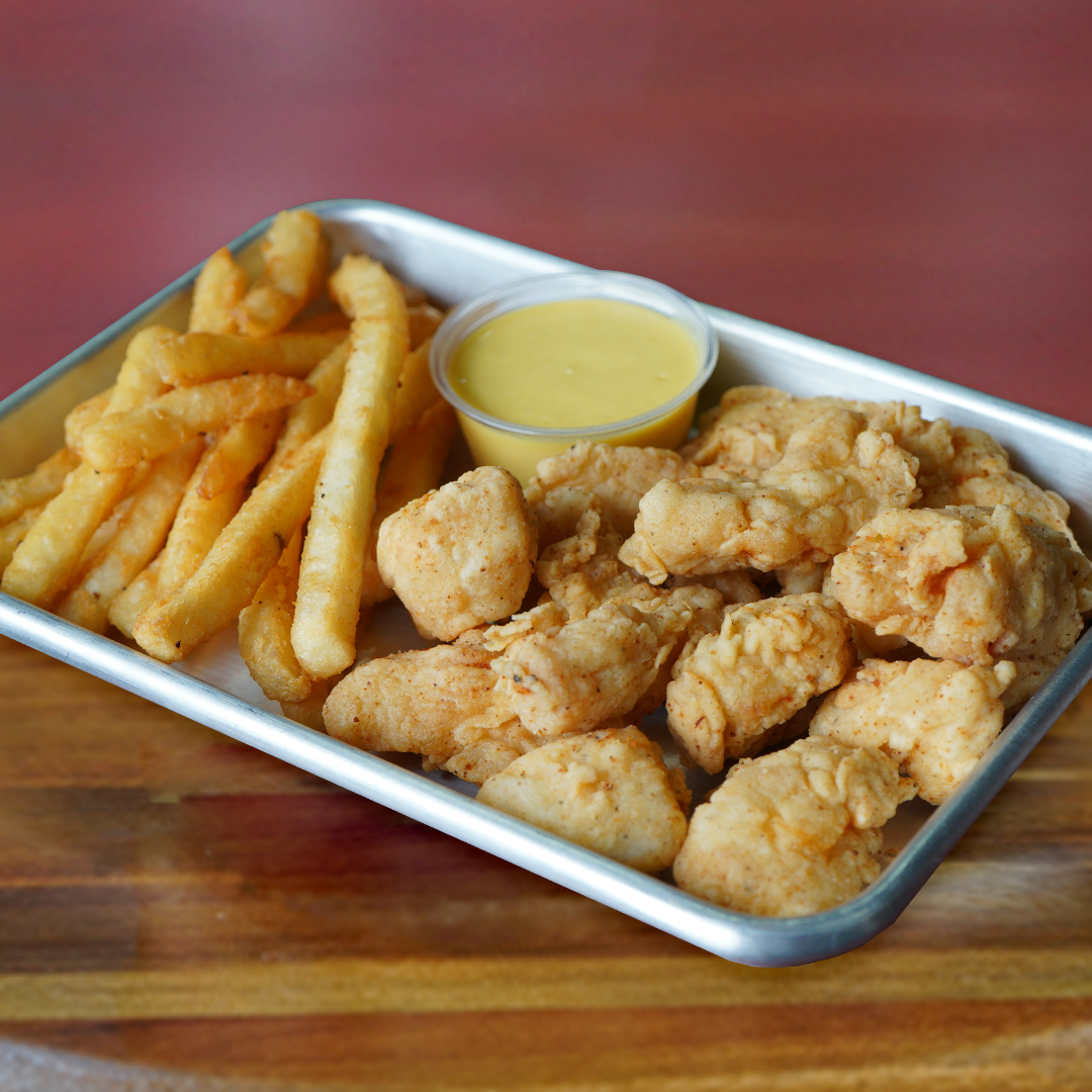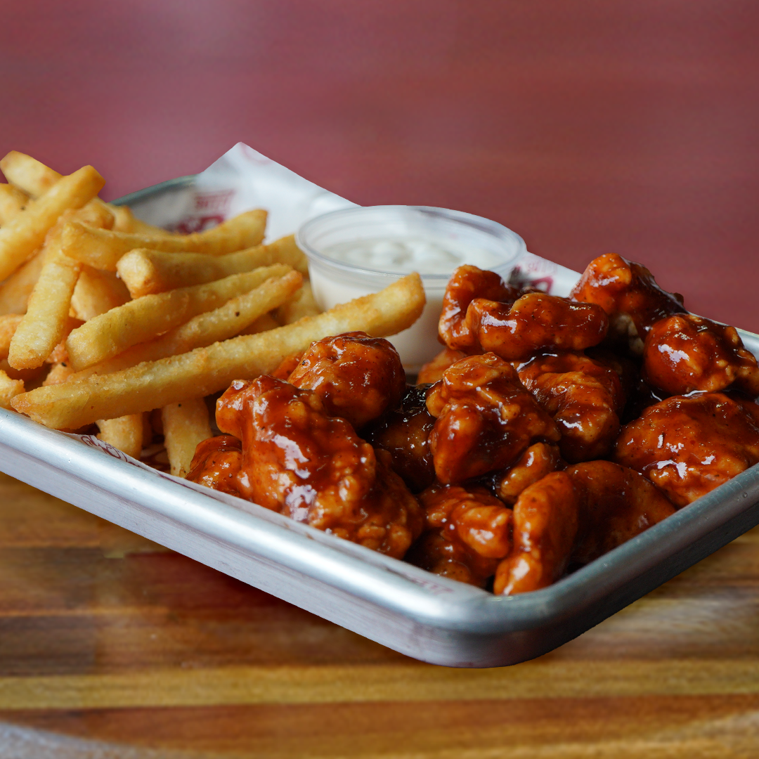 Boneless de pechuga de pollo empanizada bañados de salsa BBQ. Incluye papas a la francesa.