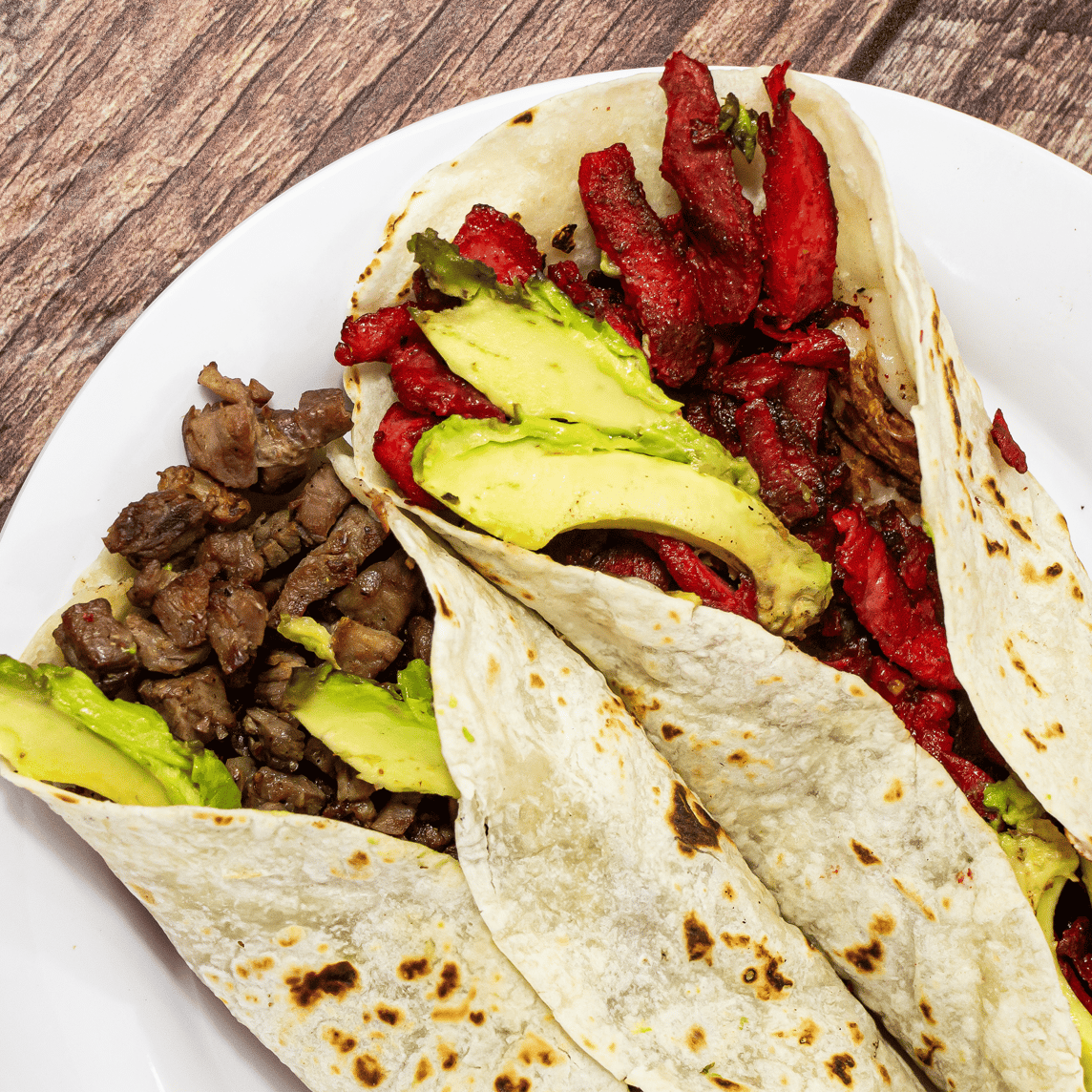 2 Burritos en tortilla de harina 20 cm. Uno de res y otro de carne de trompo, con queso y aguacate, se acompañan con cebolla asada y papitas de galeana.