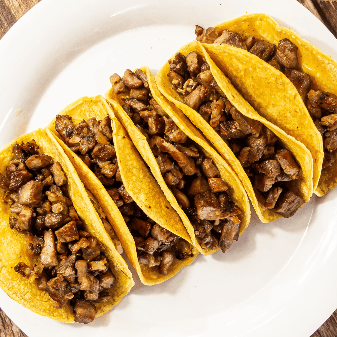 Orden de 5 tacos en tortilla de maíz. Incluye limón, cilantro, cebolla asada y salsas.