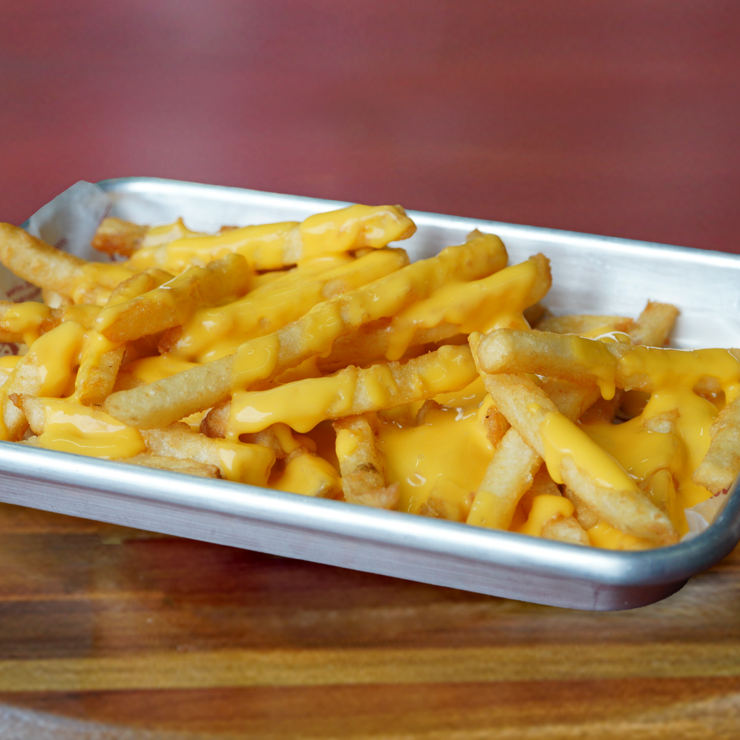 Papas a la francesa bañadas de queso amarillo cheddar.