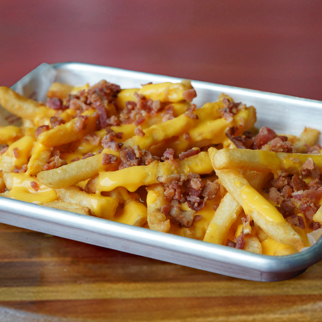 Papas a la francesa bañadas de queso amarillo cheddar y trozos de tocino.