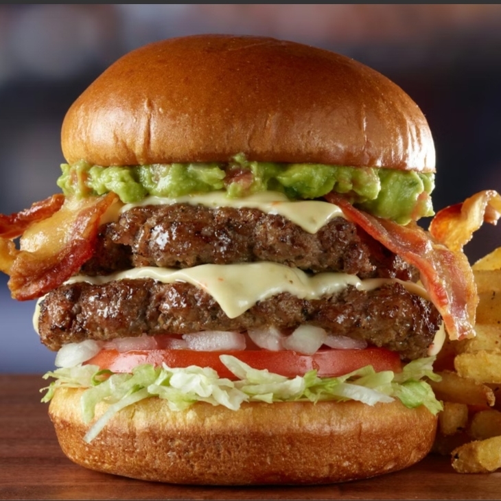 DOBLE CARNE DE RES , ACOMPAÑADA DE PAPAS A LA FRANCESA, DOBLE JAMON , DOBLE QUESO , FAJITAS DE TOCINO, LECHUGA Y ADEREZOS