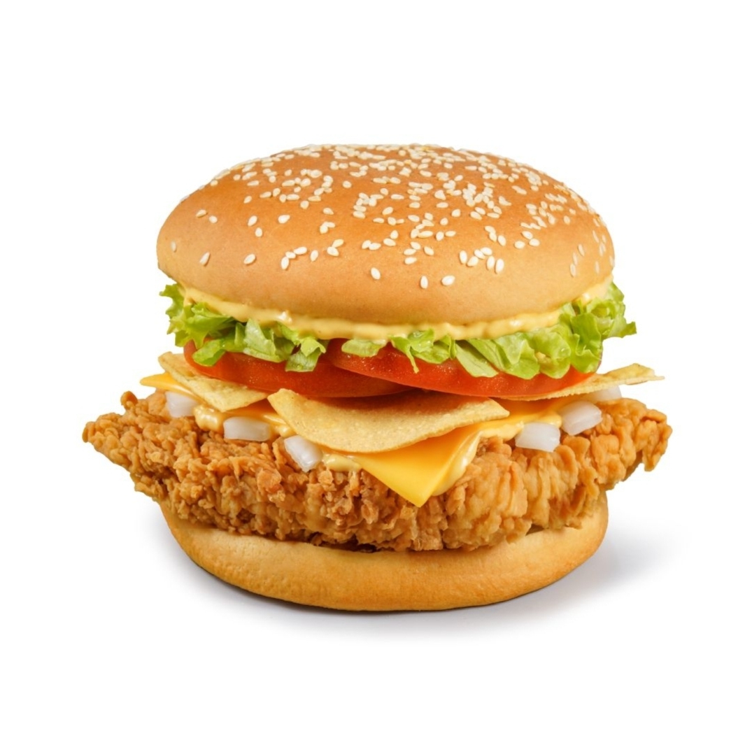 HAMBURGUESA DE POLLO ,CON PAPAS ,QUESO , JAMON , LECHUGA Y ADEREZOS