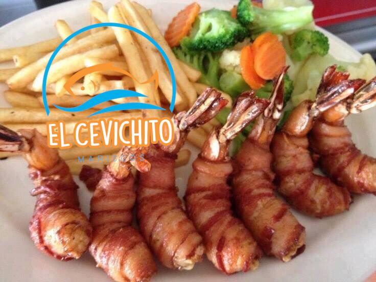 camarones (5) envueltos en tocino acompañados de arroz, ensalada, papas, totopos, aderezo, galletas y salsa