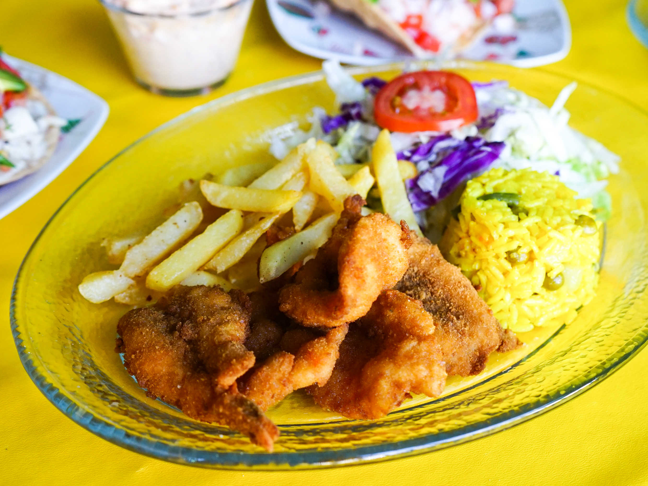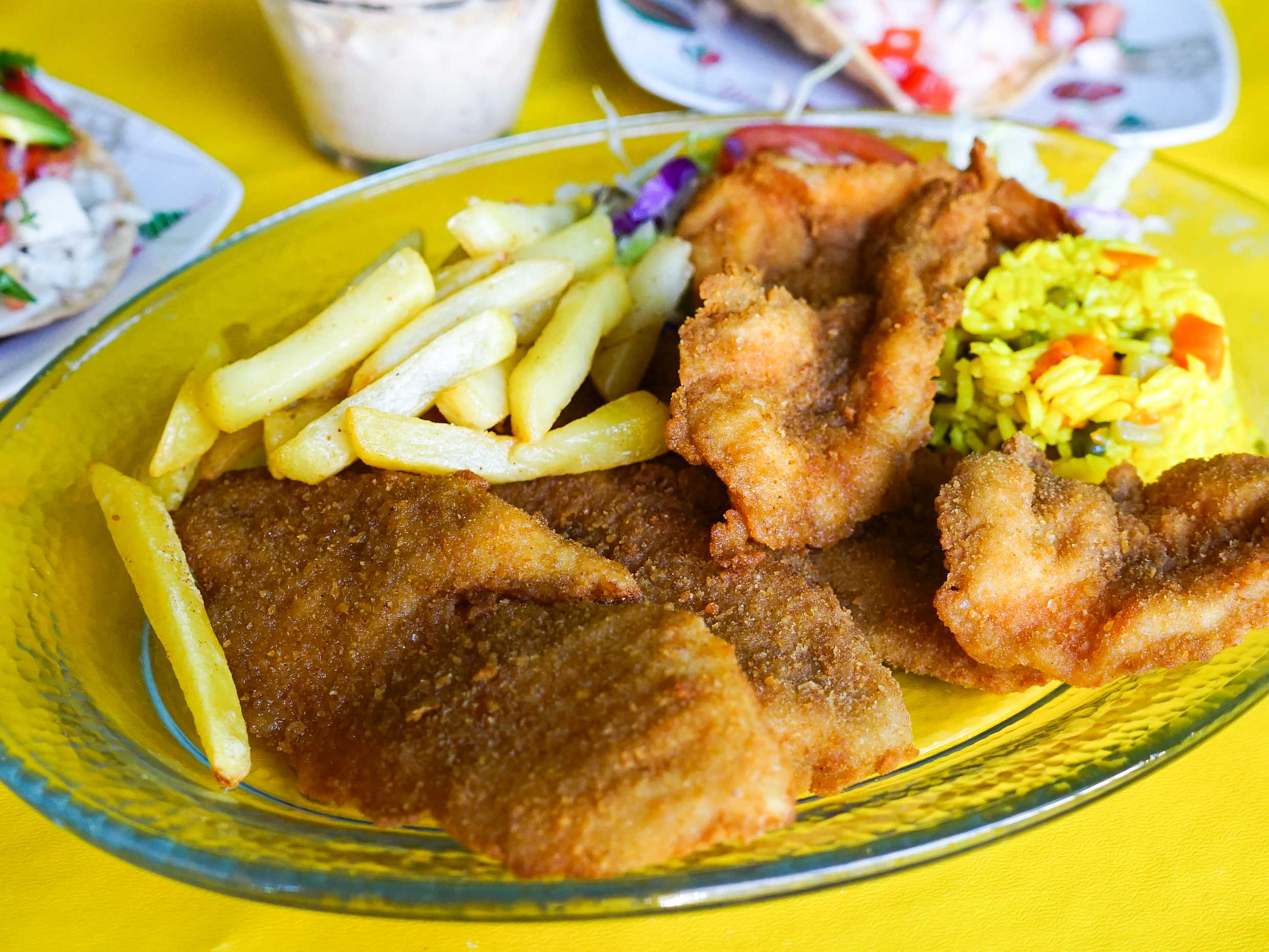 filete empanizado (3pzas), con papas, arroz, ensalada, totopo, salsa, galletas y rico aderezo