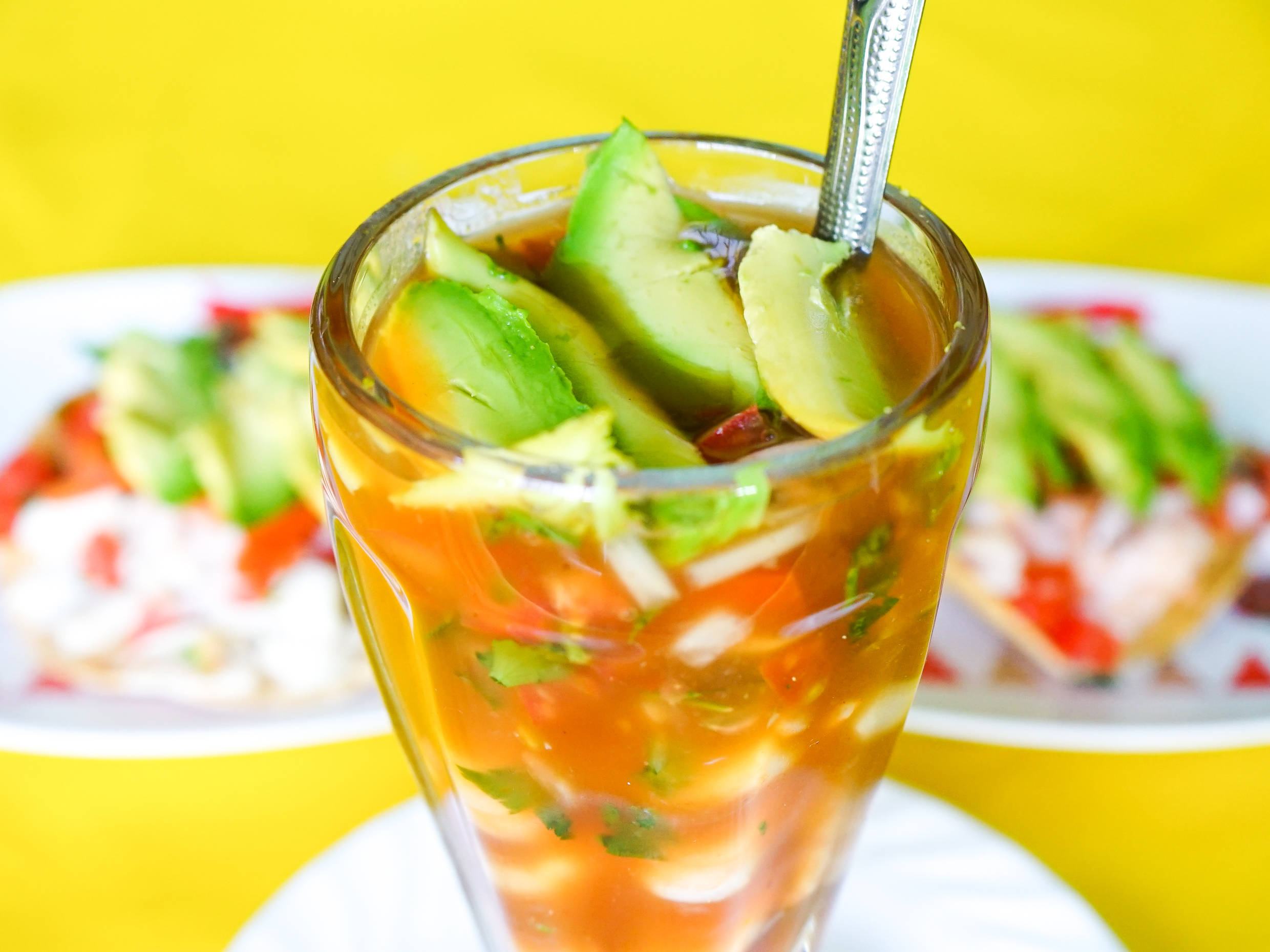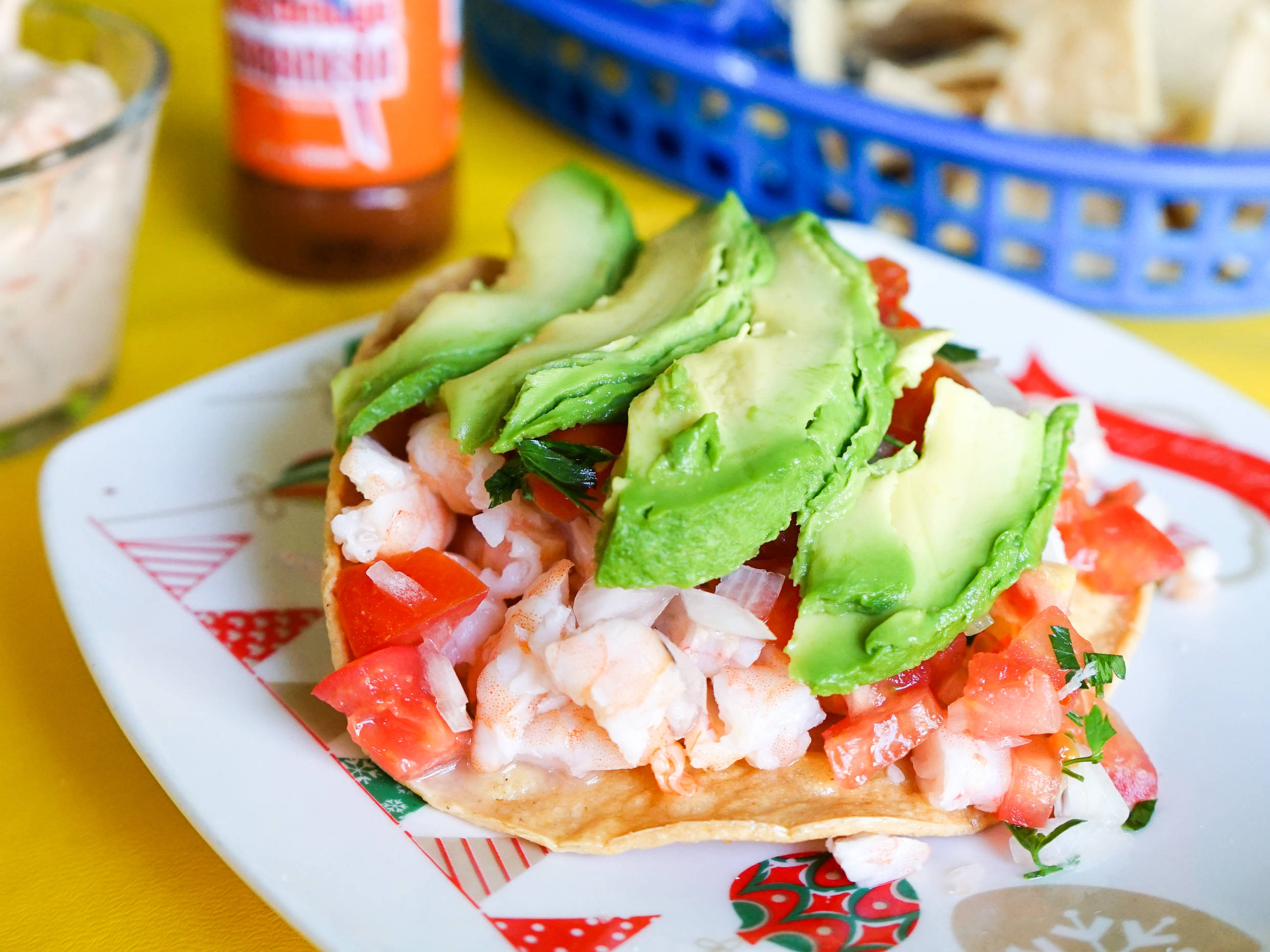 rica tostada de camaron con pico de gallo, acompañada de aderezo y salsa habanera