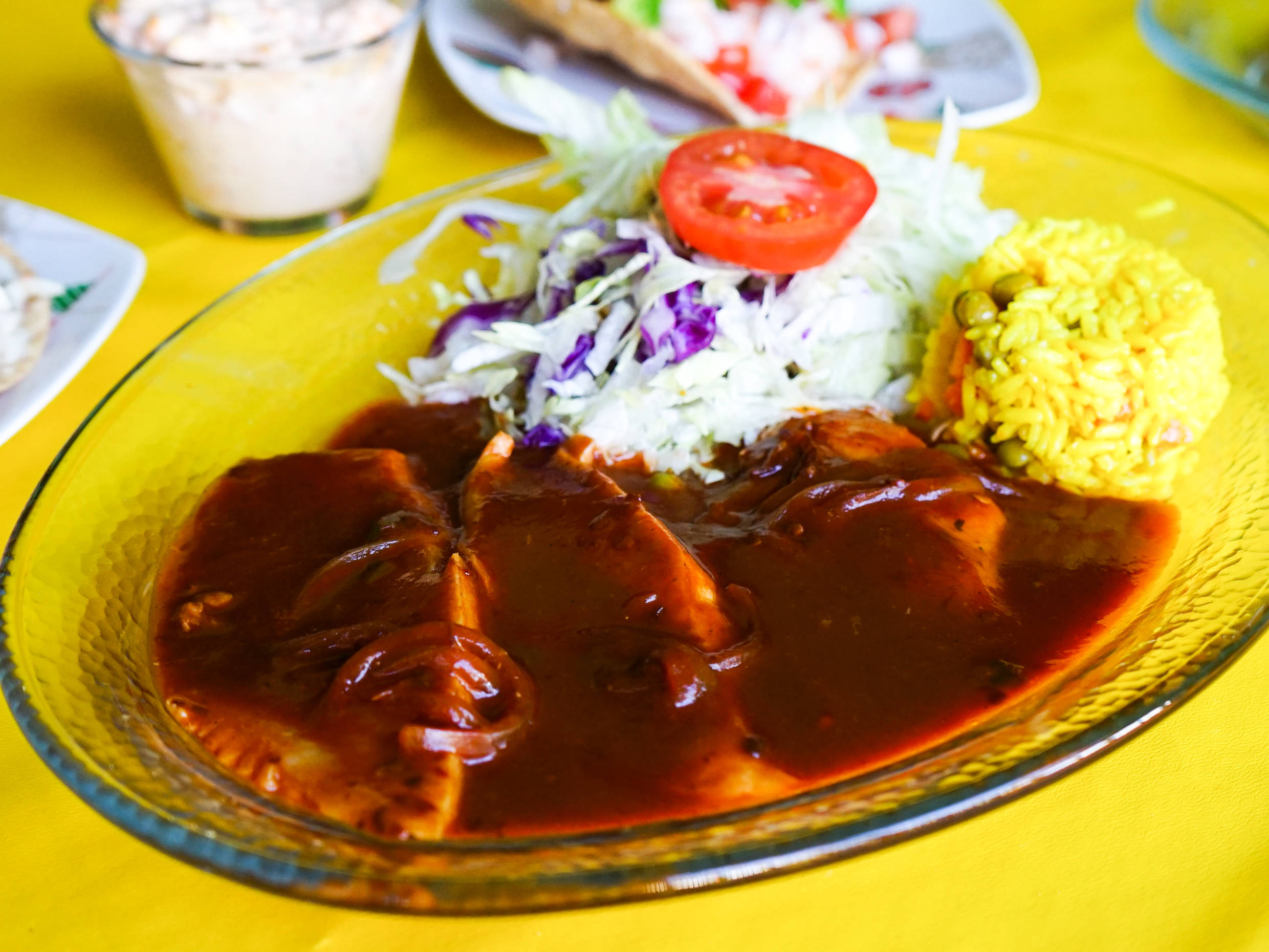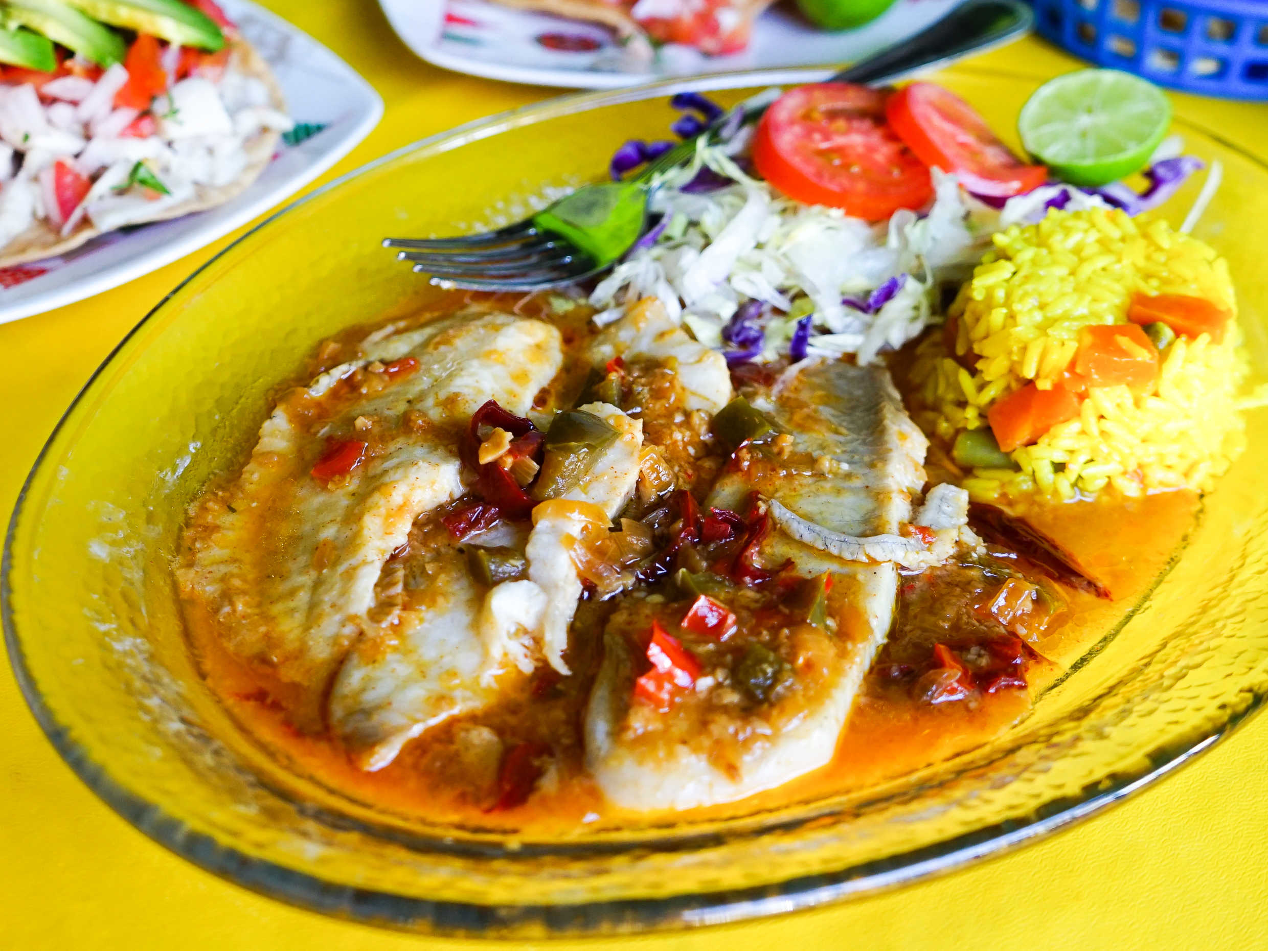 filete con chile, tomate y cebolla, acompañado con arroz, ensalada, totopos, galletas, salsa y rico aderezo