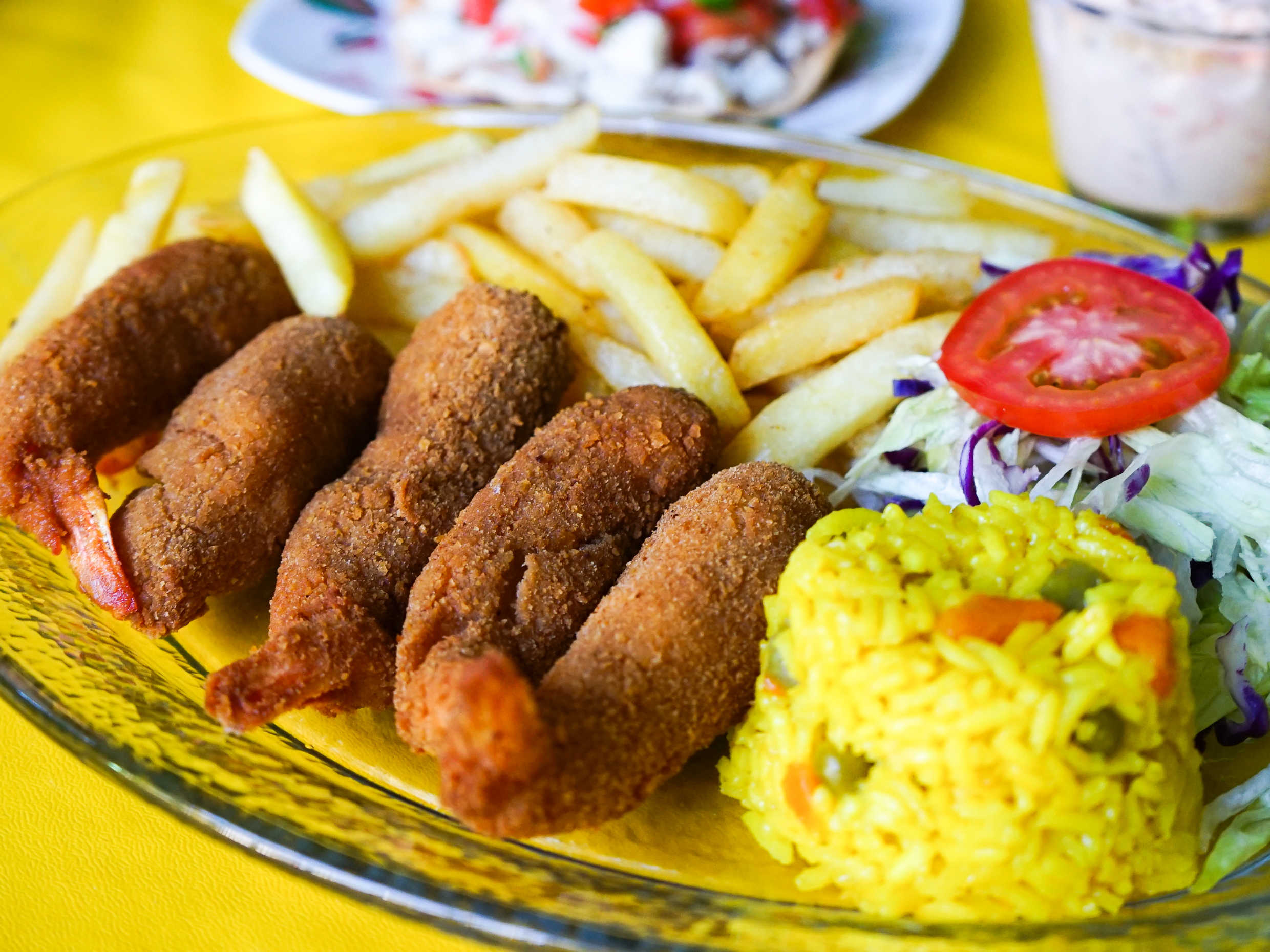 camarones rellenos de queso crema empanizados, acompañados de arroz, ensalada, papas, aderezo, totopos, galletas y salsa