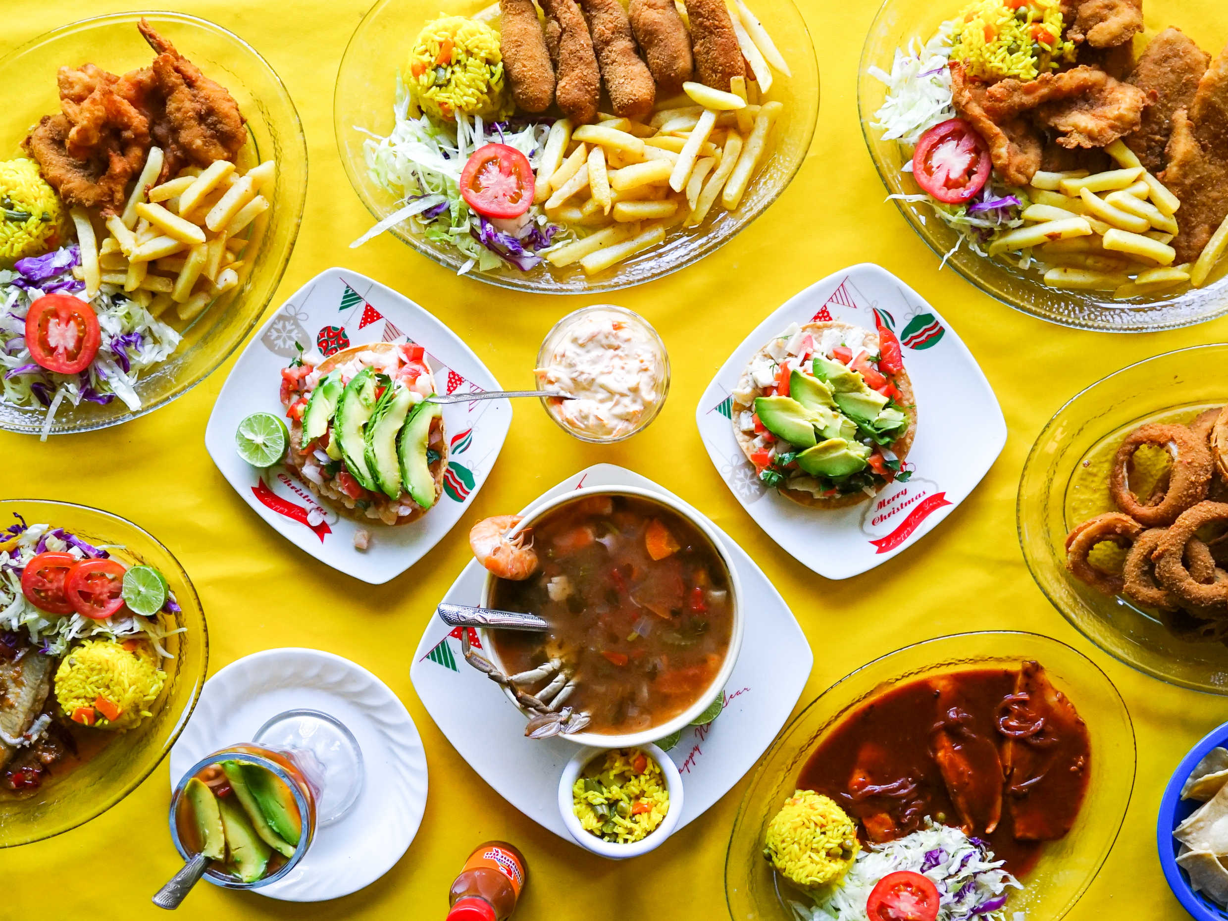 filete (4pzas) camarones (4pzas) , arroz, papas, ensalada. Acompañado con totopos, aderezo de la casa y salsa