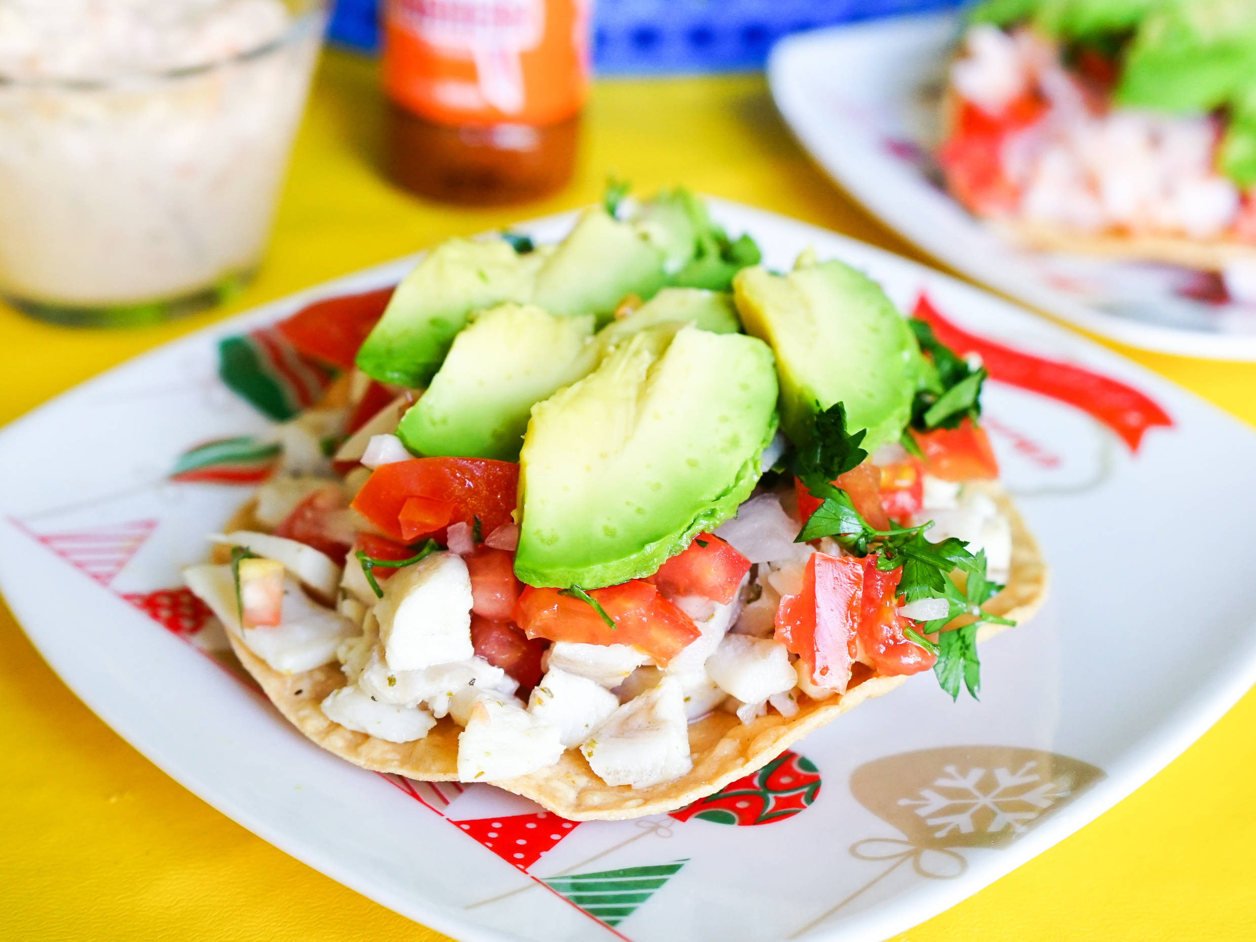 ceviche de pescado, con pico de gallo y aguacate. 1 tostada (tortila normal )