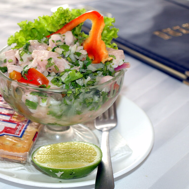 1/2 litro de coctel ceviche de pescado, acompañado de totopos, aderezo, salsa y galletas saladas