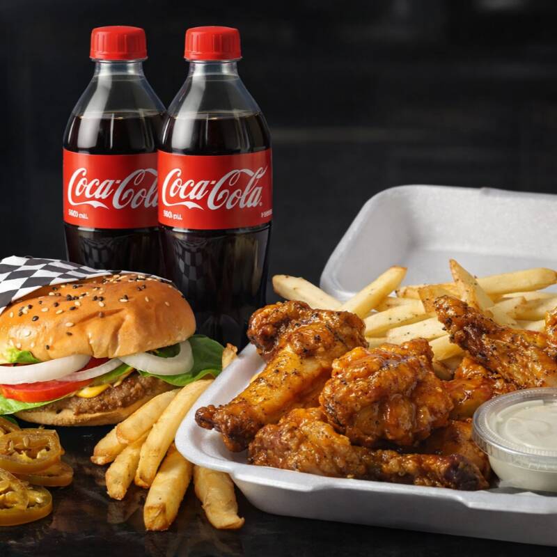 Hamburguesa de Res con Papas*1 + Alitas y Papas Fritas*1+2 refrescos coca-cola 600ml