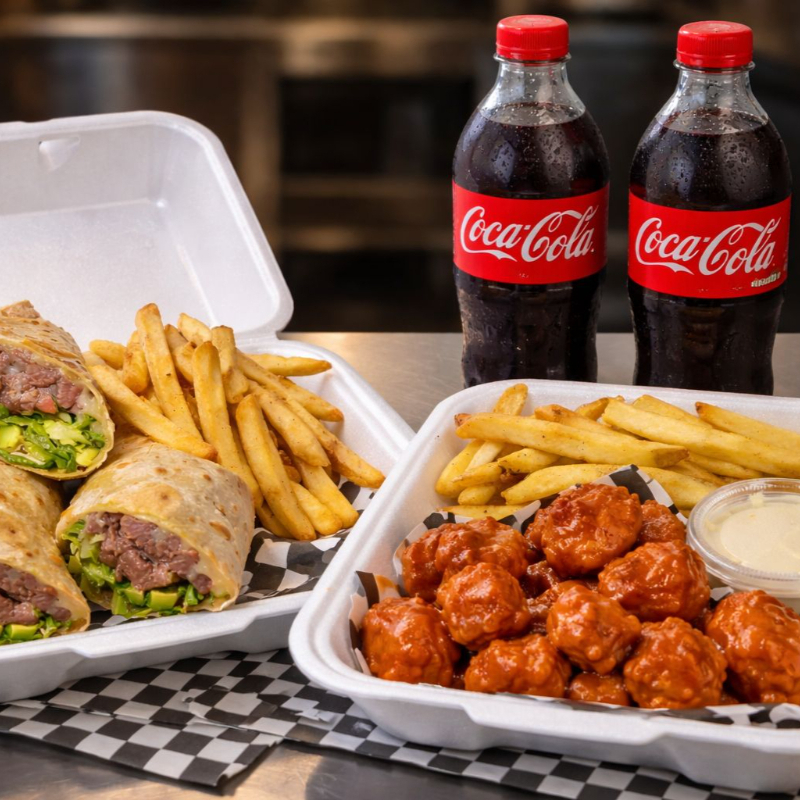 Boneless Buffalo con Papas*1 + Burrito de Arrachera*1 + COCA-COLA 600ml*2