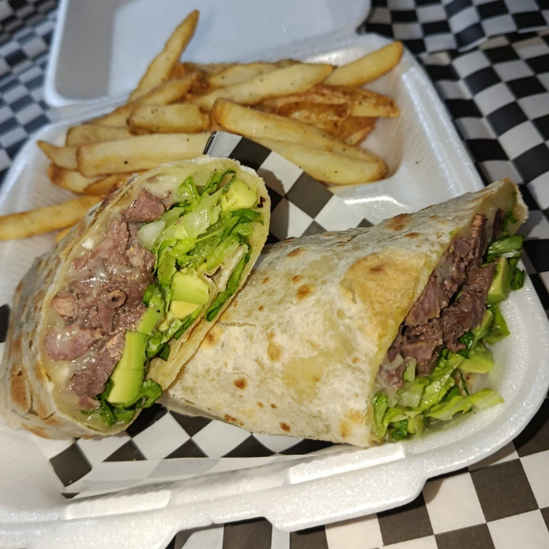 Burrito de arrachera con lechuga, aguacate y queso fundido, acompañado con una porción personal de papas fritas sazonadas