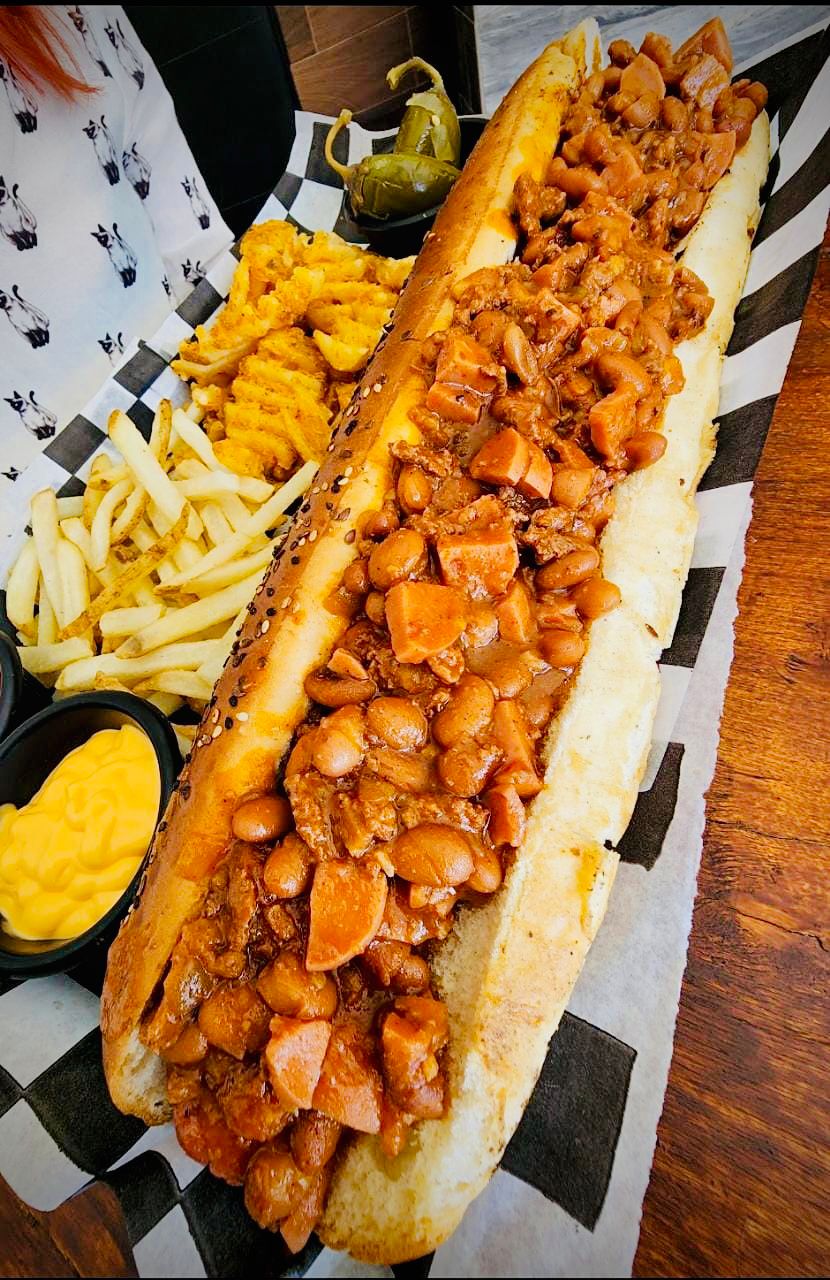 pan de 45 cm, aompañado de salchicha de pavo, y nuestro famoso chilibeans
