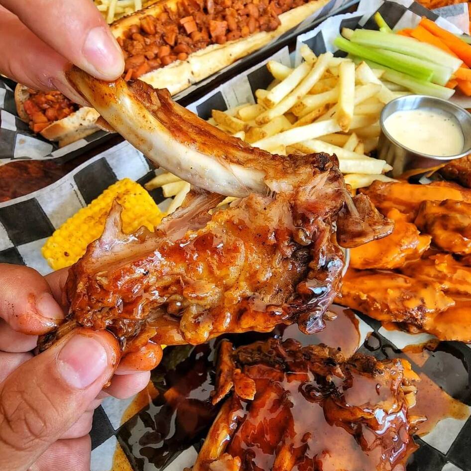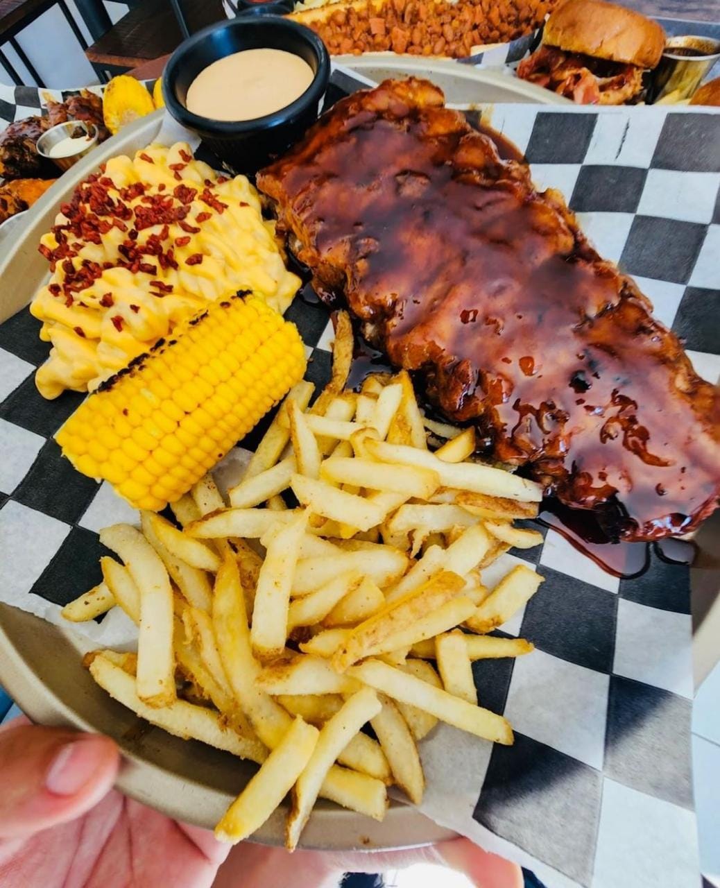 500 gramos de costilla baby back bañada en salsa bbq ahumada, acompañada de papas a la francesa mac &chesse
