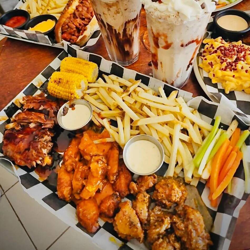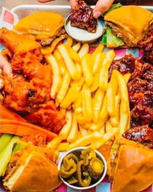 250 gramos boneles bañados en salsa de tu preferencia, 300 gramos alitas bañados en salsa de tu preferencia, 300 gramos de costillas bbq, papas a la francesa 2 dedos de queso y 2 poppers.