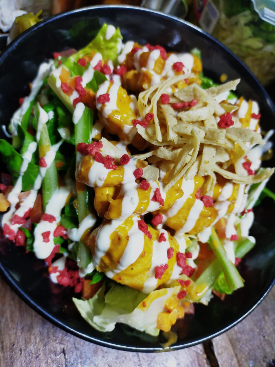 Deliciosa pechuga empanizada bañada en nuestra salsa búfalo sobre una cama de lechugas mixtas tiritas de tortillas varitas de apio y zanahoria tocino tomate y aderezo Ranch.