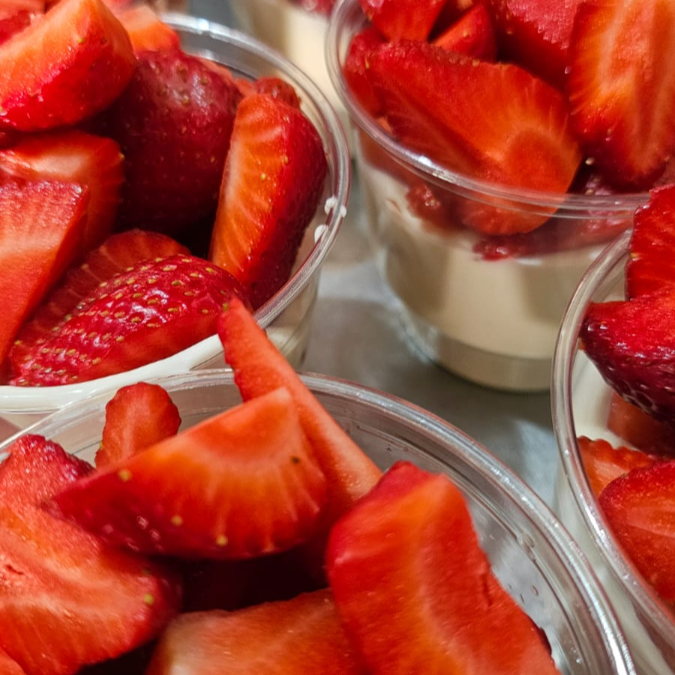 Medio litro de Fresas con crema, con deliciosa crema preparada en casa, Fresas chocolate y nuez.