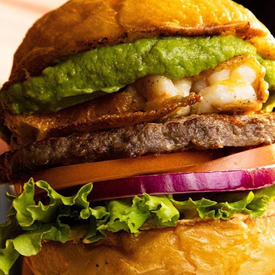 pan brioche, pepinillos, aderezo mil islas (mayonesa, catsup), lechuga, cebolla morada, tomate, carne de res, costra de queso, camarones asados, y guacamole.