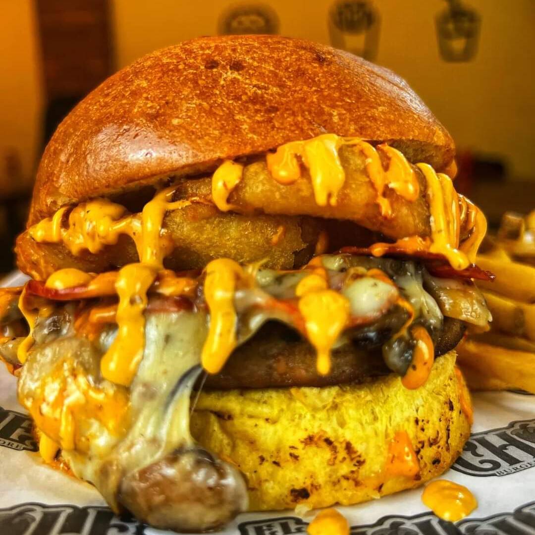 pan brioche, carne de res, queso americano, tocino ahumado, inyeccion de queso cheddar.