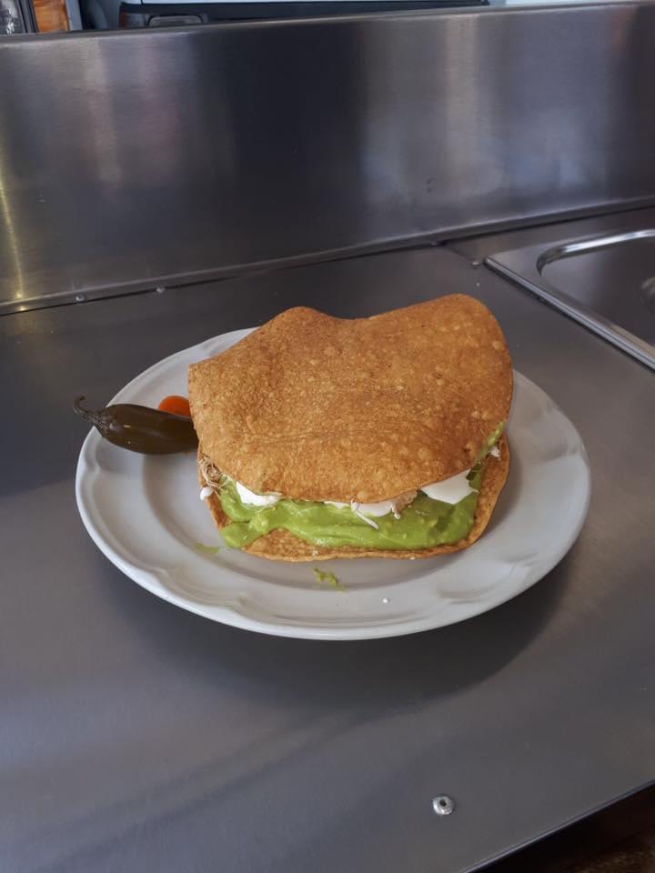 1 TOSTADA CON GUACAMOLE PECHUGA DEZMENUZADA CON CUBIERTA DE CREMA