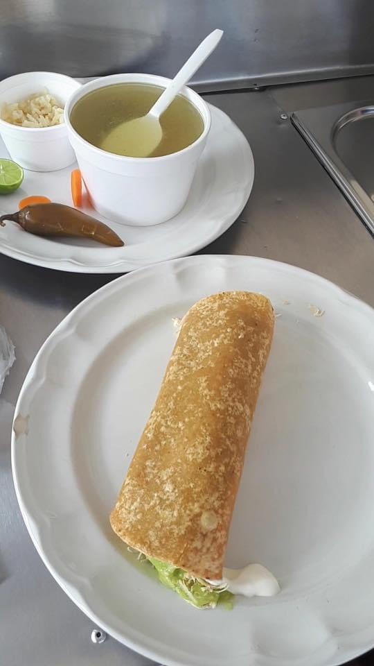 2 tapas de tostada guacamole pechuga de pollo desmenuzado crema empacados individualmente por separado para que no se remoje