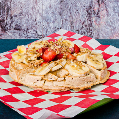 Waffle, con miel granola, fresa y platano.